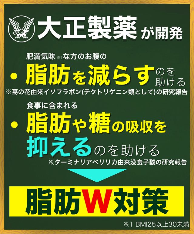 ※1:葛の花由来イソフラボン(テクトリゲニンとして)とターミナリアベリリカ由来没食子酸が配合された機能性表示食品(2024年8月時点 大正製薬調べ)※2:BMI25以上30未満