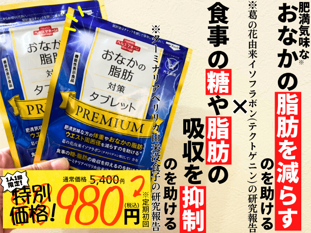 初回980円(税込)で『おなかの脂肪対策タブレットプレミアム(粒タイプ)』を始めてみたいですか?